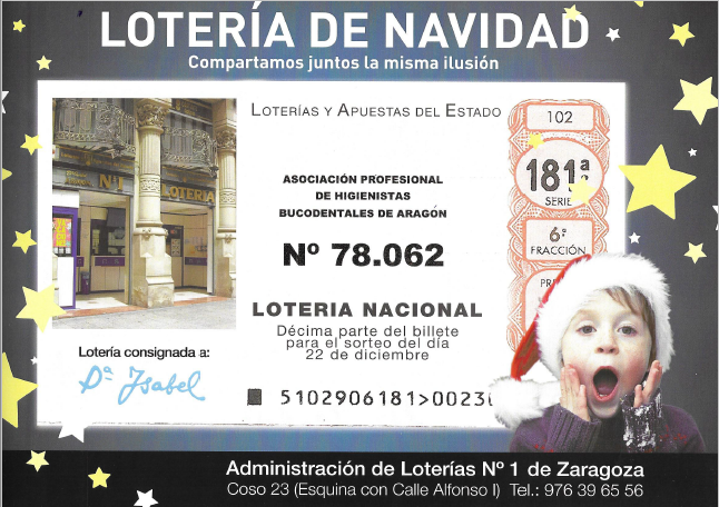 Os informamos de que la Asociación Profesional de Higienistas Bucodentales de Aragón ha reservado número de lotería para el Sorteo de Navidad de la Lotería Nacional del día 22 de diciembre.
