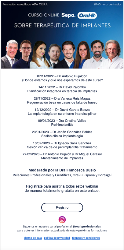 Estimad@ soci@, Desde el área de formación os hacemos llegar una nueva webinar sobre actualización de la periimplantis. Esperamos que sea de vuestro interés. Atentamente Área de formación