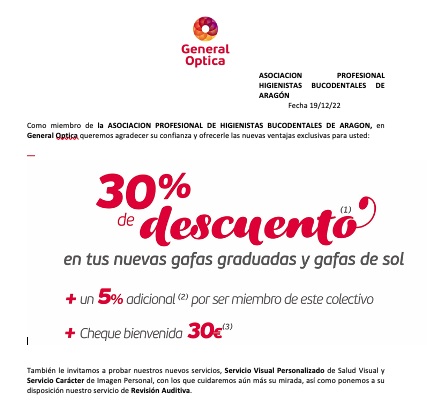 Estimad@s soci@s Os adjuntamos acuerdo de colaboración con General Óptica para aplicar 30% descuento a los asociados en las condiciones indicadas en el mismo. Un saludo Ver condiciones en el pdf adjunto