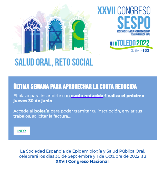 Desde el área de formación de la Asociación Profesional de Higienistas Bucodentales de Aragón os informamos que el plazo de inscripción con cuota reducida del XXVII Congreso SESPO finaliza el próximo 30 de junio.